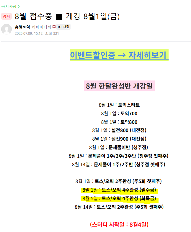 안녕하세요. 8월 개강 오픽 4주 완성을 수강하려고 했는데 사이트에선 화목금 6:50~8:20이고 카페는 월수금이고 사이트 온라인수강신청에는 또 없어서 무슨 강의가 있는지 확인 가능할까요? 6시 이후 강의로 희망하고 있습니다!