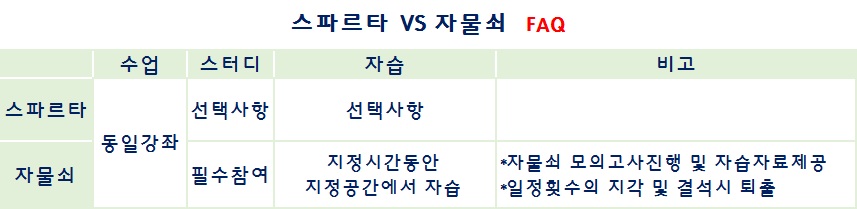 차이점은 스파르타는 스터디가 선택사항인 반면, 자물쇠반은 스터디와 자습이 의무사항입니다. 자물쇠반은 단기간 집중적으로 공부하여 점수를 내야하거나 또는 의지가 약해 학원관리하에 공부하기를 원하는 분들께 추천합니다^^